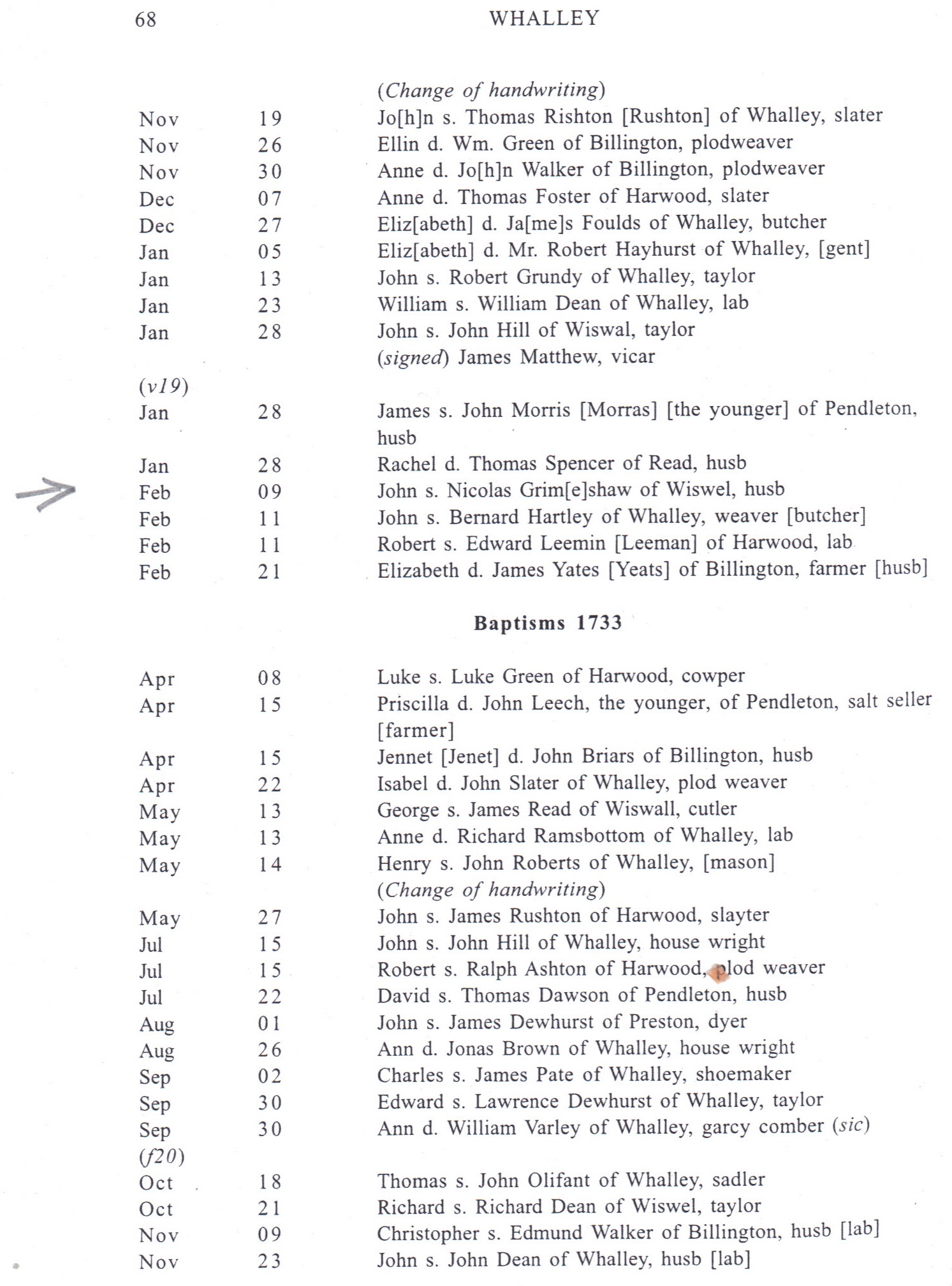 I cannot at this time connect our Nicholas of Wiswell (a hamlet in the Pendle Forest area) with the family tree which you have on line but I notice that there are a couple of male Grimshaws on the Pendle and Clayton Trees for whom no-one has continued the descendants. The researcher whom Dorinda used to do her family line, had the theory that Nicholas of Wiswell was the son of A Nicholas Grimshaw living in Heyhouses in 1696, as the family names of his children continued down to those of John Grimshaw our 5 times Grandfather, but had not given her documentary evidence to corroborate this. John Grimshaw 1733 could read and write as he signed his marriage record to Jane Waterhouse., copy enclosed, so we can presume that his father Nicholas of Wiswell was a gentleman and had the means to educate his children.