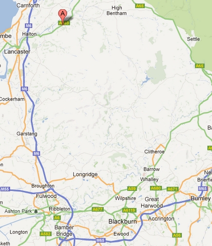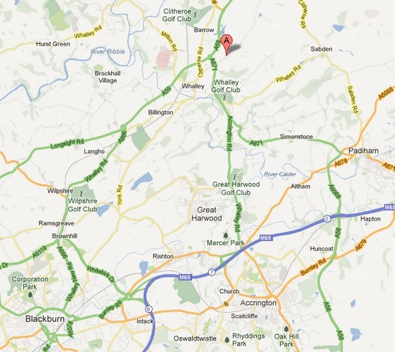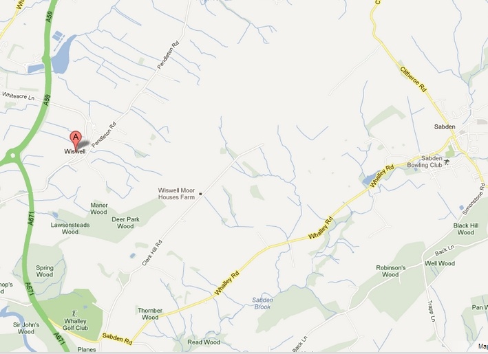 The map below shows Wiswell (red “A” indicator) in relation to nearby landmarks in Lancashire, including Blackburn to the southwest, Whalley, and Sabden, which is on the top of Pendle Hill.