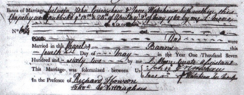 Marriage Record for John Grimshaw and Jane Waterhouse, Whitewell Parish, 1762