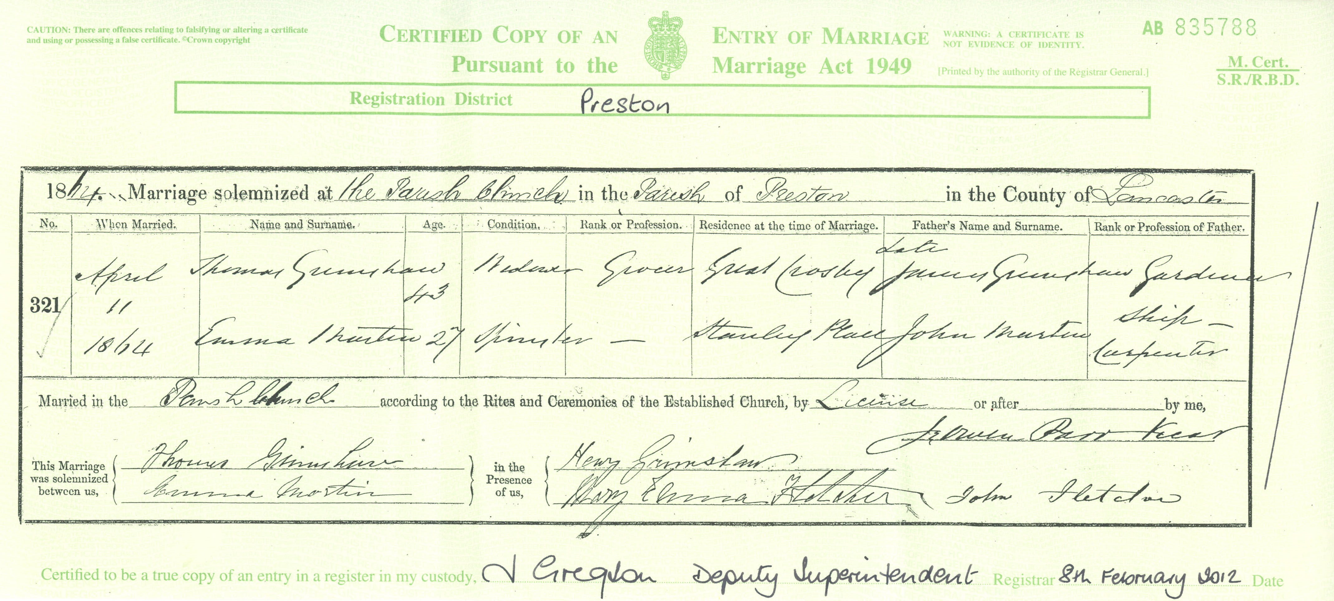 Marriage Certificate for Thomas Grimshaw and Emma Martin