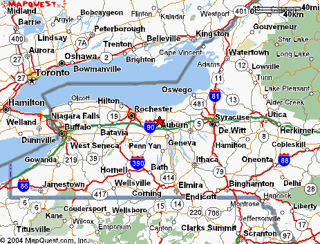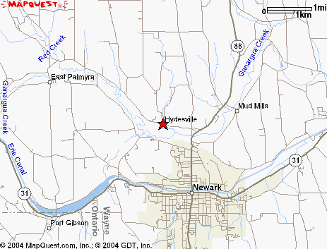 Hydesville is in western New York, about 20 miles from Rochester and not far from Auburn as shown below (upper image). It is also located near the community of Newark (lower image).
