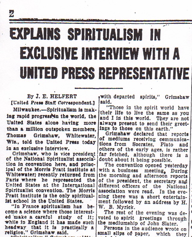 Thomas Grimshaw was a high-ranking official of the National Spiritualist Association (NSA) and apparently lectured widely on the subject. He proposed the creation of a Bureau of Education in the NSA, which occurred at the 30th annual convention in about 1922. The Morris Pratt Institute in Milwaukee, Wisconsin had previously been established as the location of the NSA educational entity. Thomas authored 26 lessons of “The General Course” (“History, Science, Philosophy and Religion of Modern Spiritualism) and 30 lessons of “The Advanced Course” (“Spiritualism, Philosophy, Mediumship and Comparative Religion”). He also served as the Superintendent of the Bureau of Education at the Morris Pratt Institute and was apparently the third principal of the Institute.