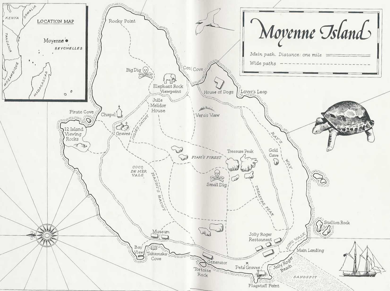 The inside covers of “A Grain of Sand” have an excellent sketch map of Moyenne Island that depicts the major features of the 22½ acre “Garden of Eden”