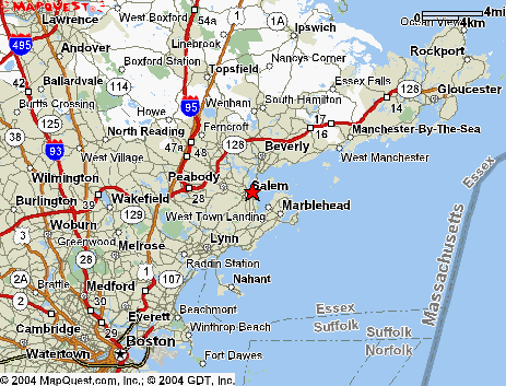 Figure 6. Maps showing the location of Salem, Massachusetts about 20 miles northeast of Boston and the location of Grimshawe House in Salem (red stars)