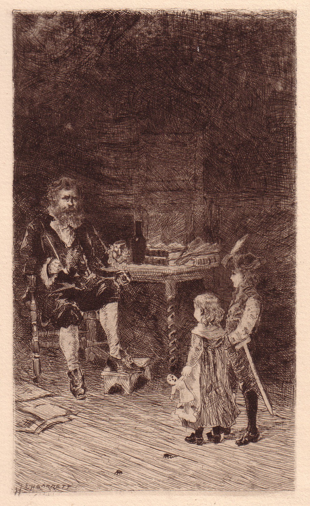 “Ah, grim Doctor!” said the little girl, now letting go of Ned’s hand and climbing upon the Doctor’s knee, “‘ou shall answer as many as Ned please to ask, because to please him and me.”