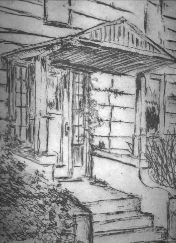 The Grimshaw (sic) House is 1 of 4 pieces created in early 1999. The historic significance of this building is its relationship to Nathaniel Hawthorne. This is where he courted his wife, Sophia Peabody. The house still stands and is bordered by one of the oldest graveyards in Salem, which sits on a raised expanse that abuts directly against the house midway up the first floor. It is known that Sophia’s father was a dental surgeon … dentist’s had far reaching roles in the 1800’s and often dealt with life threatening abscesses and other ailments much beyond what we attribute to today’s modern dentistry. The parlor of the house (also the waiting room) conveniently overlooks the graveyard. Many was the patient who may have pondered their own future and the course of their treatments as they sat patiently looking out into the scene that would often include a funeral or two for their more morbid thoughts to ponder and reflect upon. Certainly the morose and macabre nature of the building and its surrounds helped to ferment and inspire some of Hawthorne’s marvelous creativity. Alas, the building still stands (behind the Essex Museum) in most perfunctory dishevel reflecting most accurately the lost souls it has encountered over its lifetime. This particular proof is a first generation one, a significantly more handsome one is available that includes an aquatint which further accentuates the mood and tone of the structure in its present day terms. The plate size is 9.5″x13.75″.