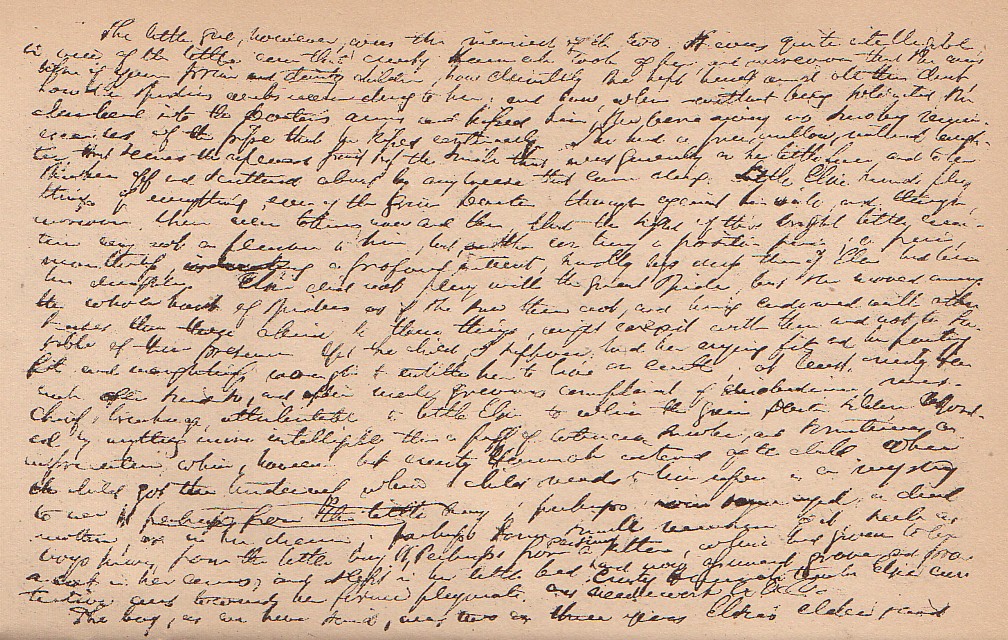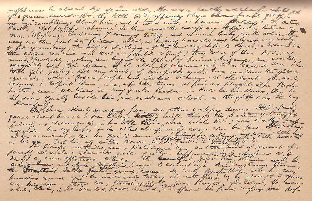 Elsie did not play with the great spider, but she moved among the whole host of spiders as if she saw them not, and being endowed with other senses than those allied to these things, might coexist with them and not be sensible of their presence. Yet the child, I suppose, had her crying fits, and her pouting fits, and naughtiness enough to entitle her to live on earth; at least, crusty Hannah often said so, and often made grievous complaint of disobedience, mischief, breakage, attributable to little Elsie; to which the grim Doctor seldom responded by anything more intelligible than a puff of tobacco smoke, and sometimes an imprecation; which, however, hit crusty Hannah instead of the child. Where the child got the tenderness which a child needs to live upon is a mystery to me; perhaps from some aged or dead mother, or in her dreams; perhaps from some small modicum of it, such as boys have, from the little boy; or perhaps it was from a Persian kitten, which had grown to be a cat in her arms, and slept in her little bed, and now assumed grave and protective airs towards her former playmate.