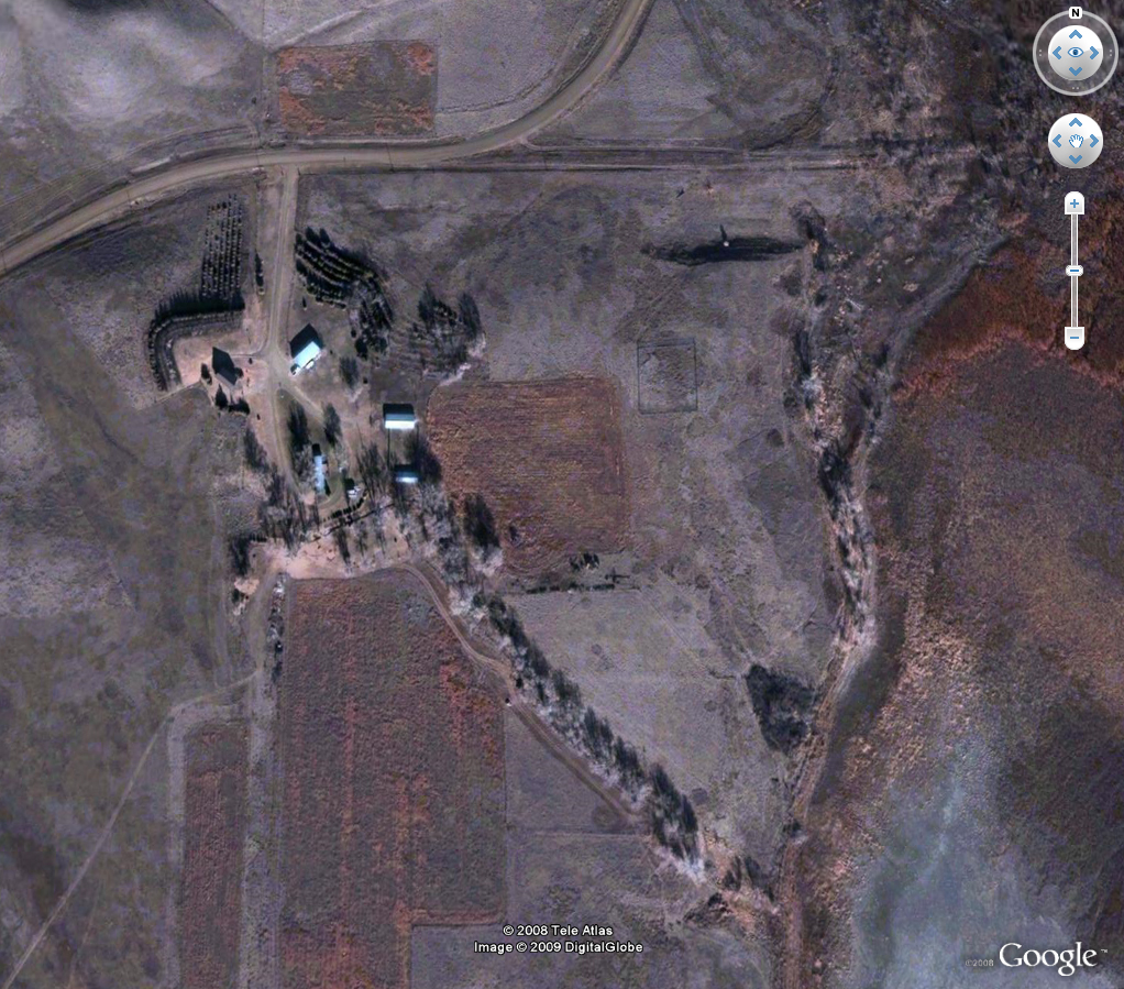 Bice Farm on GoogleEarth, 2009. Most of the building on the above photos are gone and have been replaced by new buildings. The tree line along the “artesian ditch” leading to American Crow Creek can be clearly seen.
