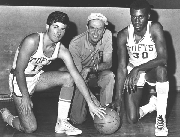 Title: Tufts basketball co-captains John Schwarz and Glenn Smith with Coach ‘Woodie’ Grimshaw, center, 1971