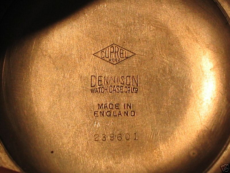 With the back off you will see it says CUPREL regd. Then DENNISON Watch Case Co. Ltd. Made in England. 239601.