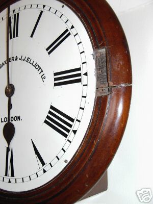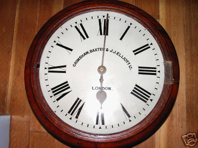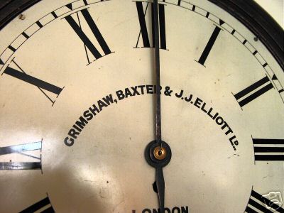 Lot No 403. Description: An early 20th century mahogany dial timepiece, the white enamel dial signed ‘Grimshaw, Baxter and J.J. Elliott Limited, London’, the single fusee brass movement with anchor escapement, similarly signed to the back plate, brass bezel lacking, 46 cm diameter.