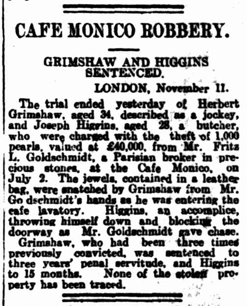 The trial ended yesterday o£ Herbert Grimshaw, aged 34, described as a jockey, and Joseph Higgins, aged 28, a butcher, who were charged with the theft of 1,000 pearls, valued at £40,000, from Mr. Fritz L. Goldschmidt, a Parisian broker in precious stones, at the Cafe Monico, on July 2. The jewels, contained in a leather bag, were snatched by Grimshaw from Mr. Goldschmidt’s hands as he was entering the cafe lavatory. Higgins, an accomplice, throwing himself down and blocking the doorway as Mr. Goldschmidt gave chase. Grimshaw, who had been three times previously convicted, was sentenced to three years’ penal servitude, and Higgins to 15 months. None of the stolen proparty has been traced.