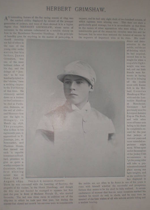 Herbert Grimshaw enjoyed a successful early career as a jockey, as indicated by the following article and photo in “Racing Illustrated” in 18955.