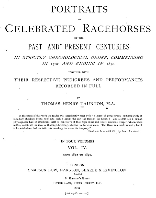 3Taunton, Thomas H., 1888, “Portraits of Celebrated Racehorses”: London, Sampson Low, Marston, Searle & Rivington, p. 376-380.