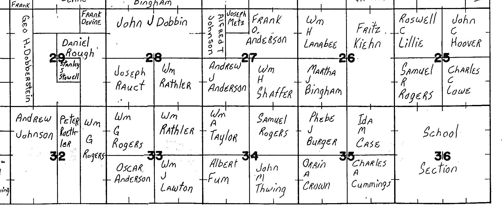 Note the quarter section owned by Oscar Anderson in Section 33. Oscar’s son, Arthur V. Anderson, married Charles Cummings’ daughter, Maude, and then daughter Grace Cummings after Maude died.