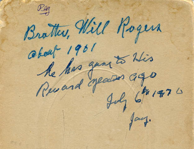 “Brother, Will Rogers – about 1901 – he has gone to his – reward years ago – July 6th 1970 – Jay”