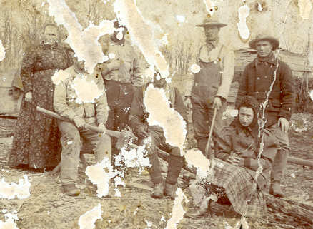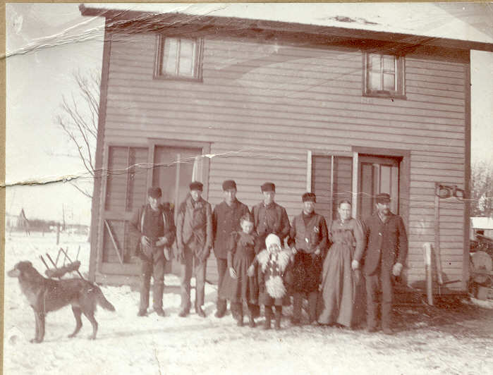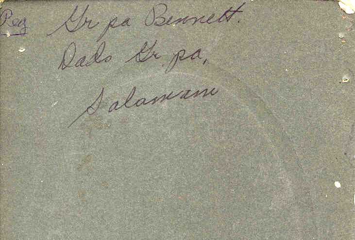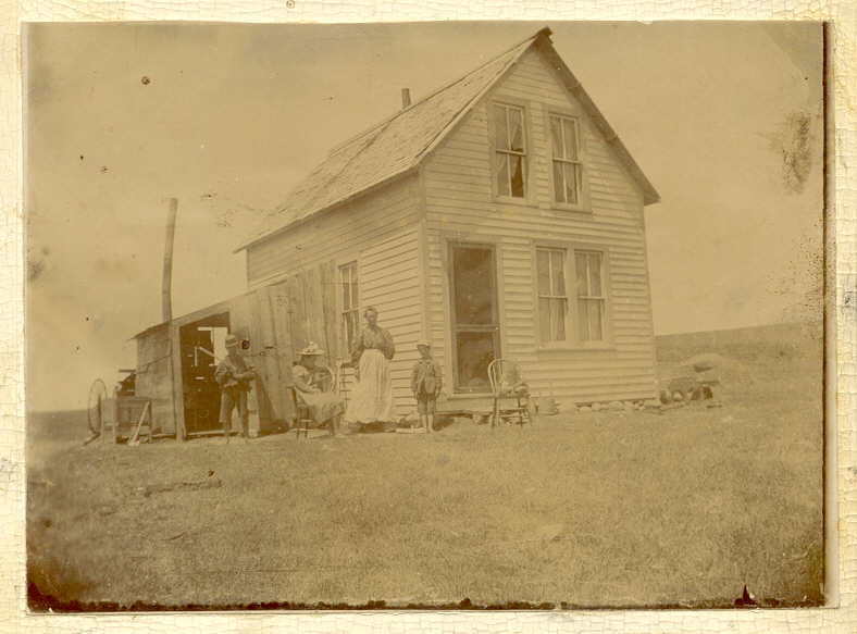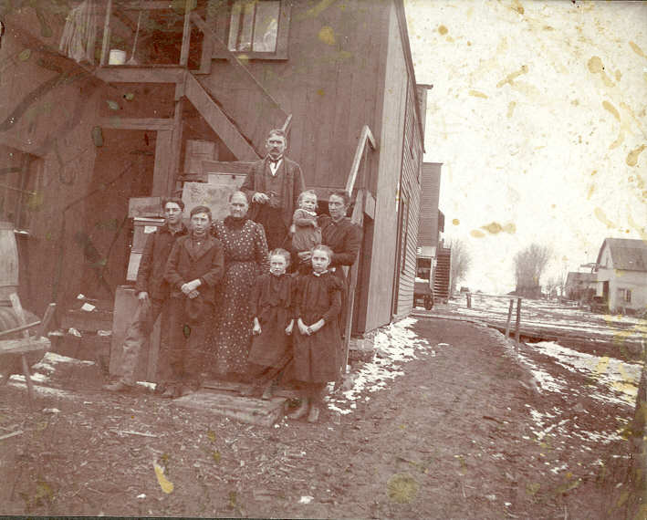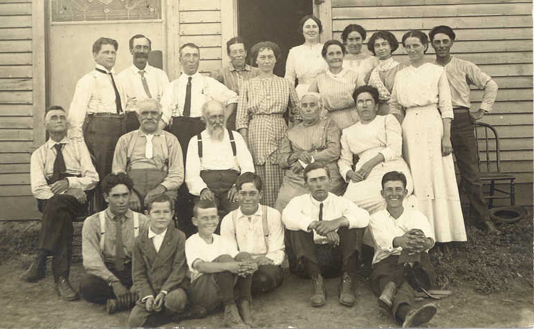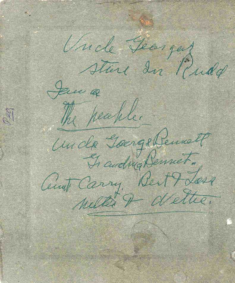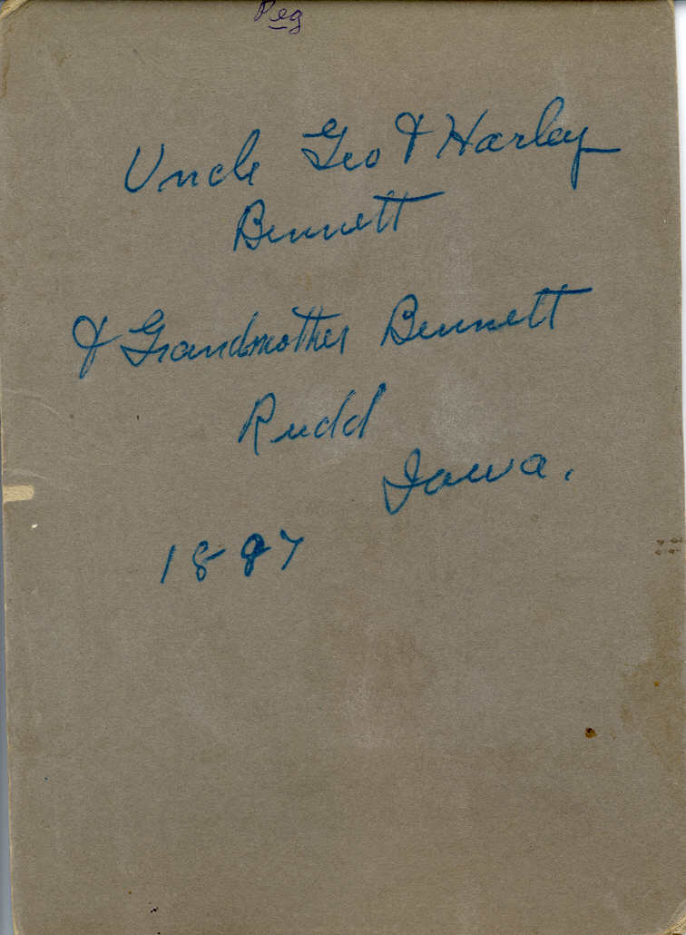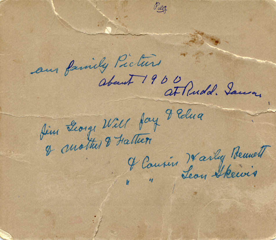 “Our family picture – about 1900 – at Rudd, Iowa – Jim George Will Jay & Edna – & mother & father – & cousin Harley Bennett – & cousin Leon Skewis”