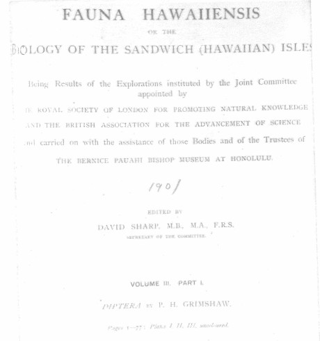 Percy Grimshaw also made a substantial contribution to another major biological work, a British study of the fauna of the Hawaiian (Sandwich) islands5. His portion was on “Diptera” and appeared in Part I of Volume III. The full text, consisting of 97 pages, can be viewed by clicking here. The cover and part of the first page are shown below.