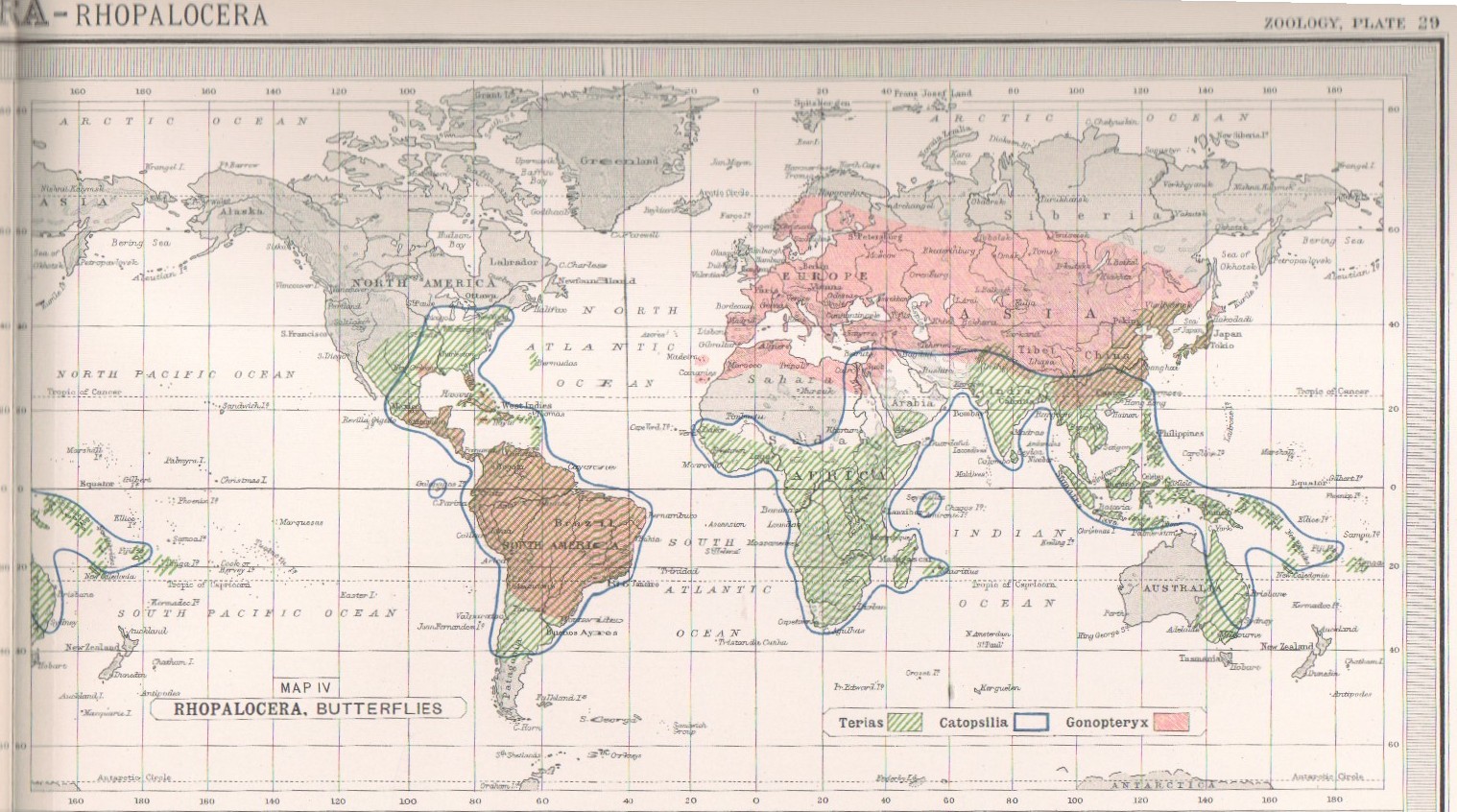 Image 4 of Plate 29 (Map iv, in upper right hand corner) shows world distribution of members of the Lepidoptera family, namely Rhopalocera: Terias, Catopsilla, Gonopteryx. This map is shown below.