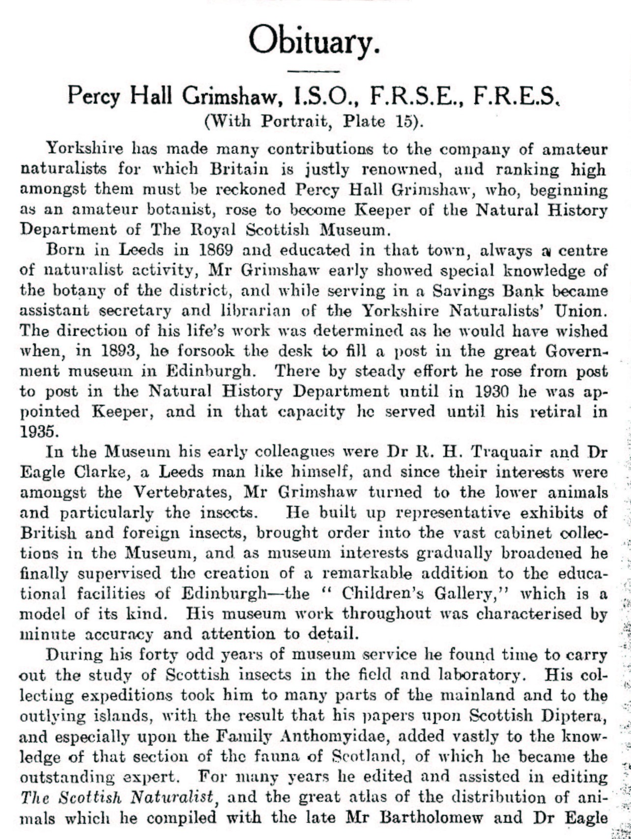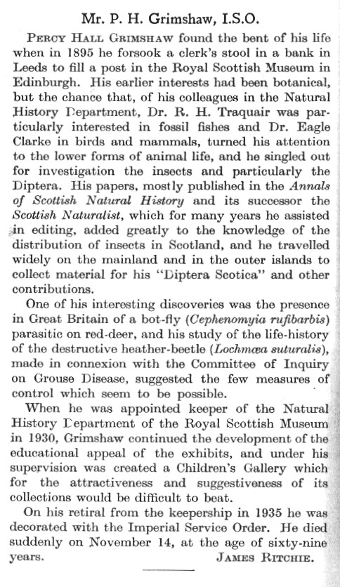 Percy Hall Grimshaw found the bent of his life when in 1895 he forsook a clerk’s stool in a bank in Leeds to fill a post in the Royal Scottish Museum in Edinburgh. His earlier interests had been botanical, but the chance that, of his colleagues in the Natural History Department, Dr. R. H. Traquair was particularly interested in fossil fishes and Dr. Eagle Clarke in birds and mammals, turned his attention to the lower forms of animal life, and he singled out for investigation the insects and particularly the Diptera. His papers, mostly published in the Annals of Scottish Natural History and its successor the Scottish Naturalist, which for many years he assisted in editing, added greatly to the knowledge of the distribution of insects in Scotland, and he travelled widely on the mainland and in the outer islands to collect material for his “Diptera Scotica” and other contributions.