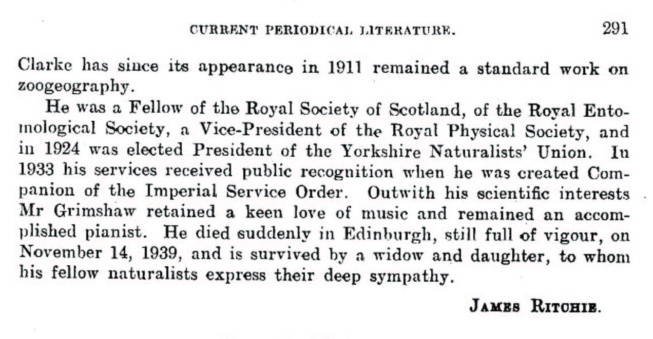He was a Fellow of the Royal Society of Scotland, of the Royal Entomological Society, a Vice-President of the Royal Physical Society, and ill 1924 was elected President of the Yorkshire Naturalists’ Union. In 1933 his services received public recognition when he was created Companion of the Imperial Service Order. Outwith his scientific interests Mr. Grimshaw retained a keen love of music and remained an accomplished pianist. He died suddenly in Edinburgh, still full of vigour, on November 14, 1939, and is survived by a widow and daughter, to whom his fellow naturalists express their deep sympathy.