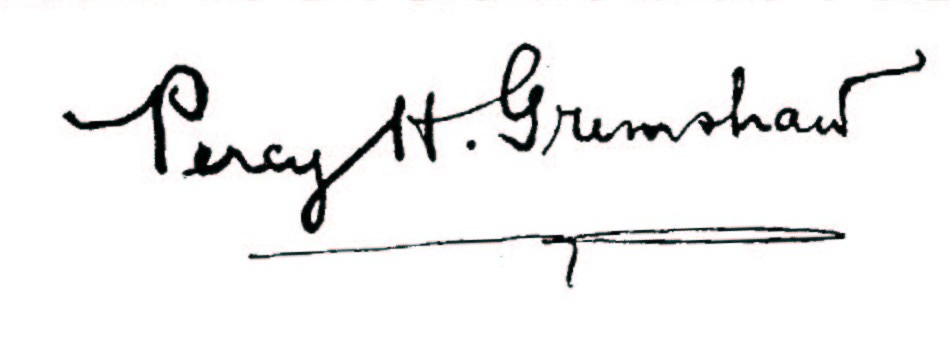 Percy Grimshaw was apparently descended from the Edward and Dorothy (Raner) Grimshaw family line in Yorkshire. A candidate for his father, David Grimshaw, has been identified in the descendant chart of Edward and Dorothy Grimshaw. If this David proves to be the correct candidate, then Percy was the nephew of the noted painter, Atkinson Grimshaw. Percy married Jeanie Blair White at an unknown date, and they had one daughter. He died in November 1939.