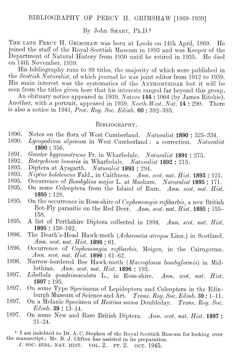 2Smart, John, 1945, Bibliography of Percy H. Grimshaw, 1869-1939: Journal of the Society for the Bibliography of Natural History, v 2, p. 39-42.