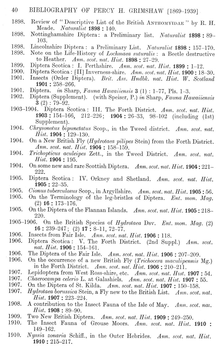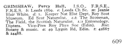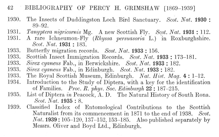 1Ritchie, James, 1939, Obituary. Percy Hall Grimshaw, I.S.O., F.R.S.E., F.R.E.S. (with Portrait, Plate 15): North Western Naturalist, v. 14, p. 290-291.