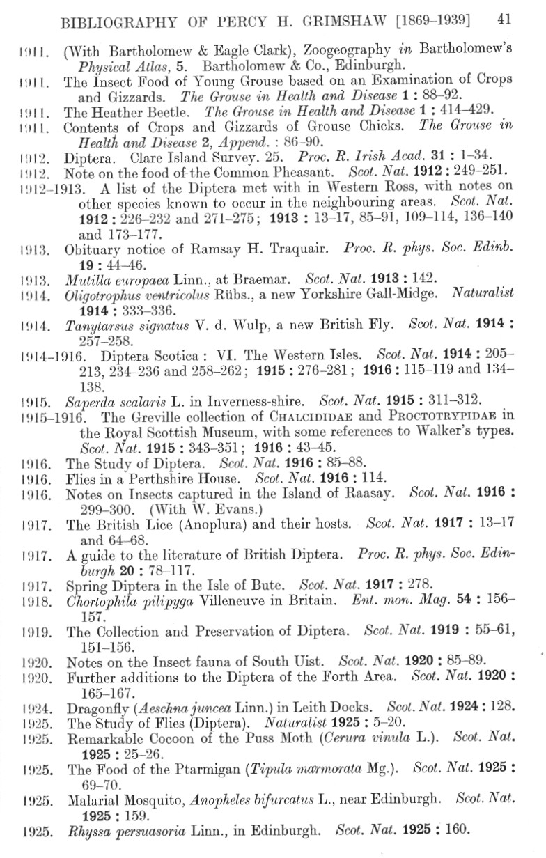His bibliography runs to 89 titles, the majority of which were published in the Scottish Naturalist, of which journal he was joint editor from 1912 to 1939. His main interest was the systematics of the Anthomyiidae but it will be seen from the titles given here that his interests ranged far beyond this group. An obituary notice appeared in 1939, Nature 144 ; 1004 (by James Ritchie). Another, with a portrait, appeared in 1939, North-West. Nat. 14: 290. There is also a notice in 1941, Proc. Roy. Soc. Edinb. 60:; 392-393.
