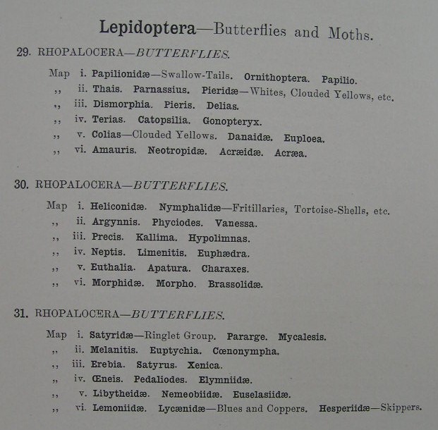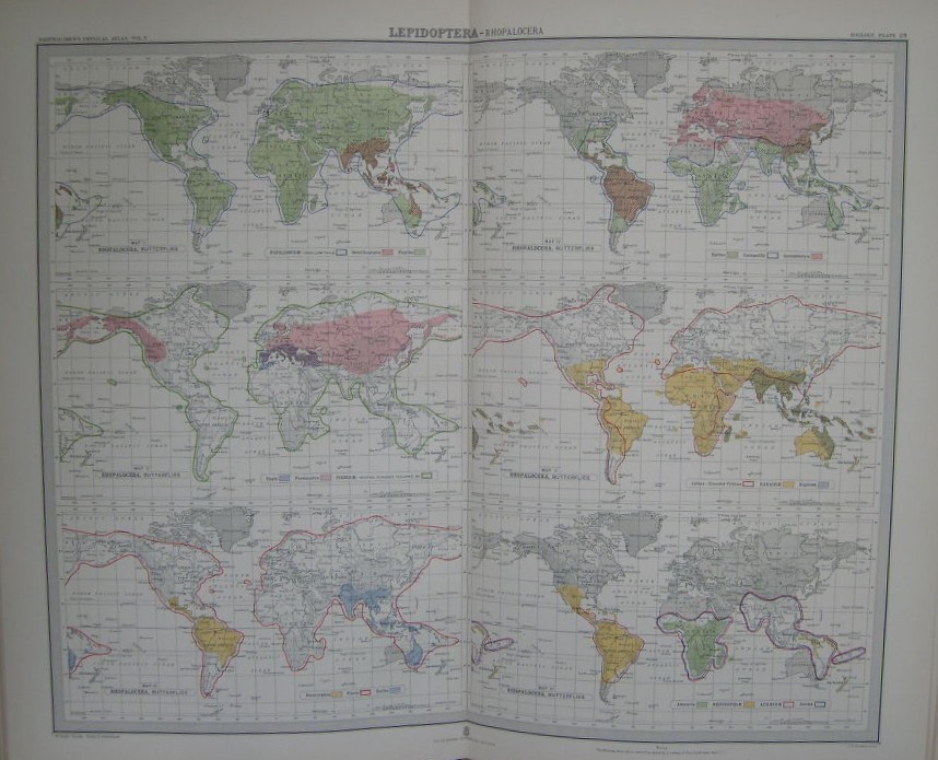 An example of one of the plates showing world distribution of insect families (or members of families) is shown below; it is Plate 29, which includes members of the Lepidoptera family.