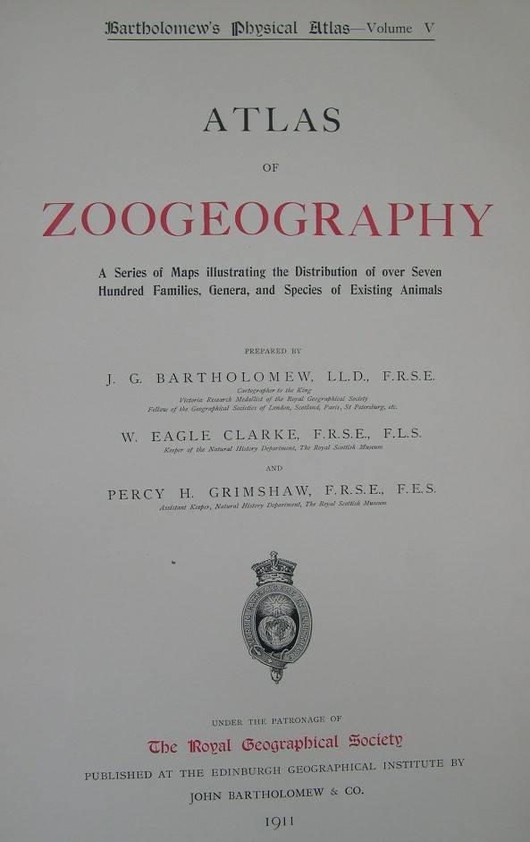 3Bartholomew, John G., W. Eagle Clarke and Percy H. Grimshaw, 1911, Zoogeography. Volume 5 of Physical Atlas: J.G. Bartholomew, ed. Edinburgh, John Bartholomew & Co., 67 pp + 36 plates.