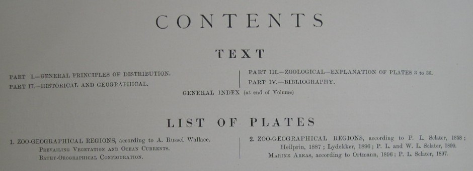 The title page of Zoogeography is shown below. Note that it includes “A Series of Maps Illustrating the Distribution of Over Seven Hundred Families, Genera, and Species of Existing Animals”.