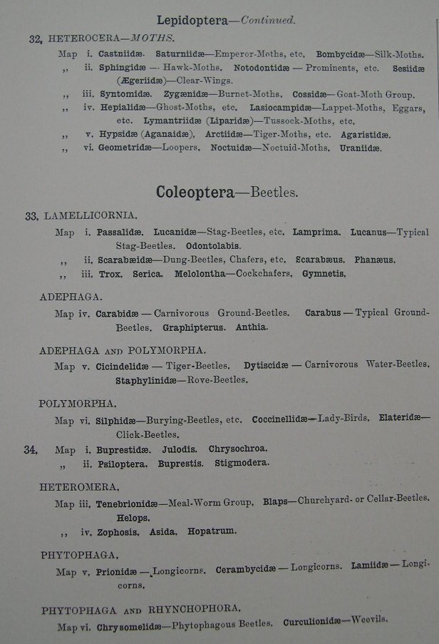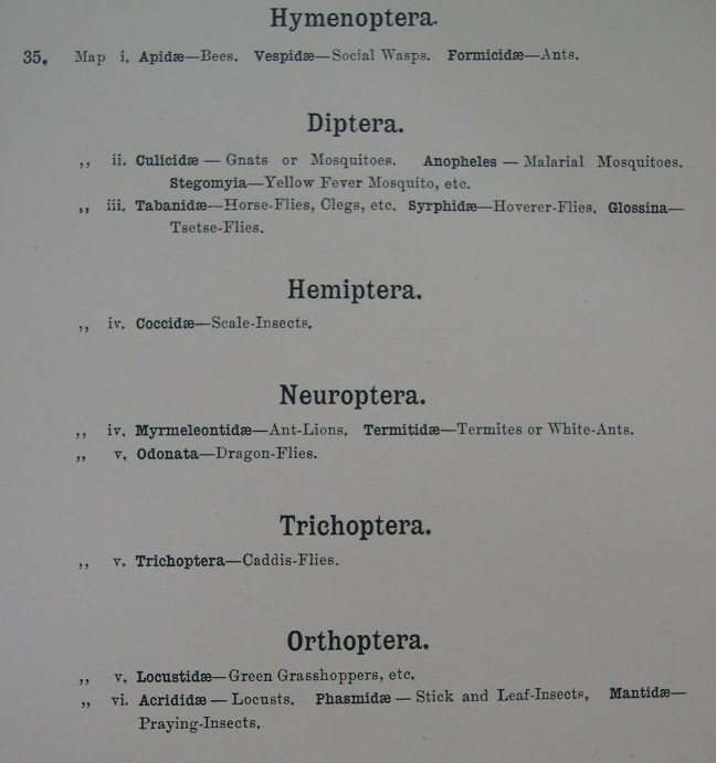 The sections of the table of contents of Zoogeography covering Percy Grimshaw’s contributions are shown below. World maps showing the distribution of members of the eight listed insect families are provided as Plates 29 to 35 of the atlas.