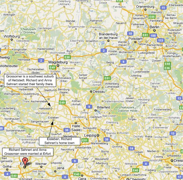 A regional map of Germany showing the location of Erfurt, where Richard and Anna were married, is shown below. The location southwest of Berlin is indicated. Also shown are Eisleben, home town of Richard, and Grossoerner (a suburb of Hettstedt), where Richard and Anna operated a bakery and had their first four children before emigrating to America. It is likely that Richard is actually from Grossoerner, since it was the birthplace of his father, grandfather, and great-grandfather .