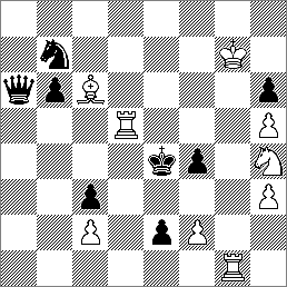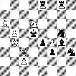 This second Loshinsky example, also a mate in two, is from Tijdschrift v.d. Nederlandse Schaakbond, 1930, and is one of the most famous of all chess problems. It is a complete block (if white could pass his first move, then he could reply to every black move with a mate), and white’s key, 1.Bb3, holds this block, making no threat, but putting black in zugzwang. Black has six defences leading to three Grimshaws, one of them a pawn Grimshaw:
