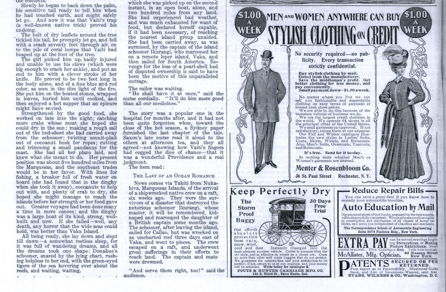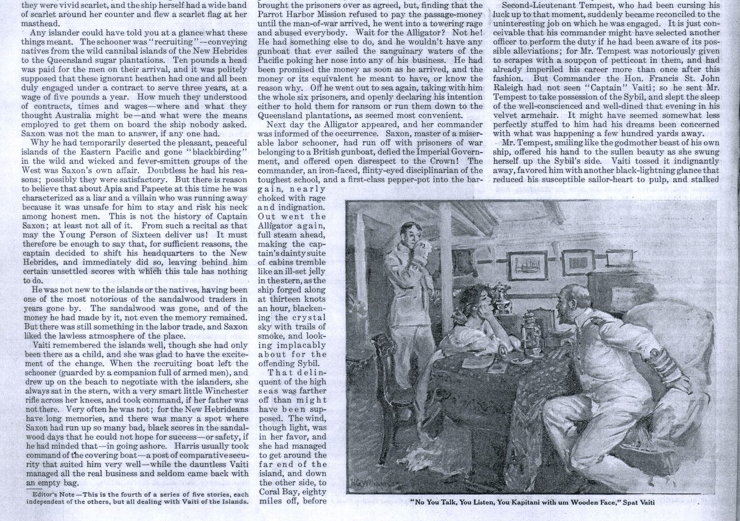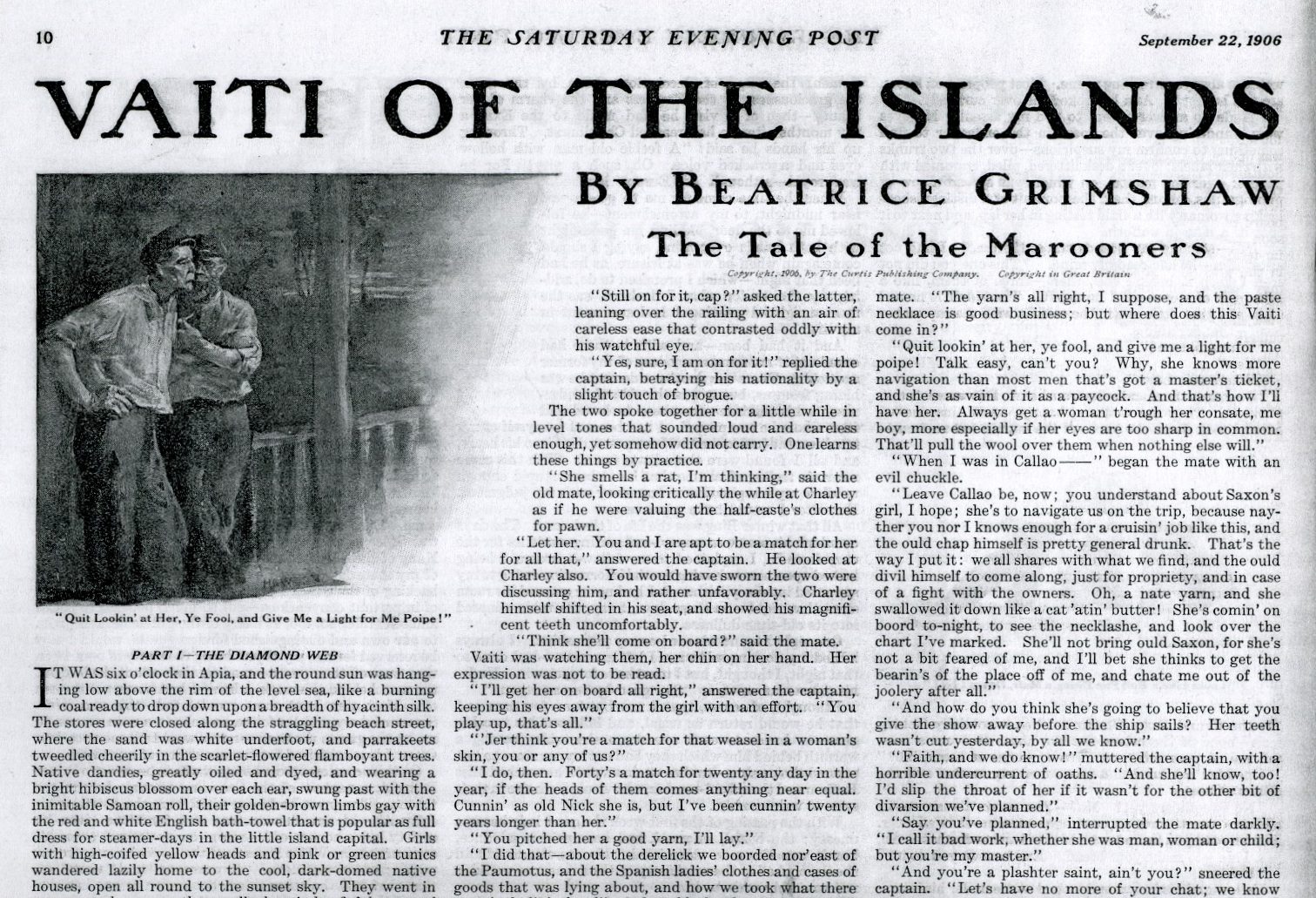 Beatrice Grimshaw published many serialized fictional articles in the journals of her day in addition to her numerous books. Beatrice and her life are described on a companion webpage. She apparently got started publishing in mainstream journals in 1906 with a series of five articles in The Saturday Evening Post. These articles had different titles but were all derived from Beatrice’s book, Vaiti of the Islands.