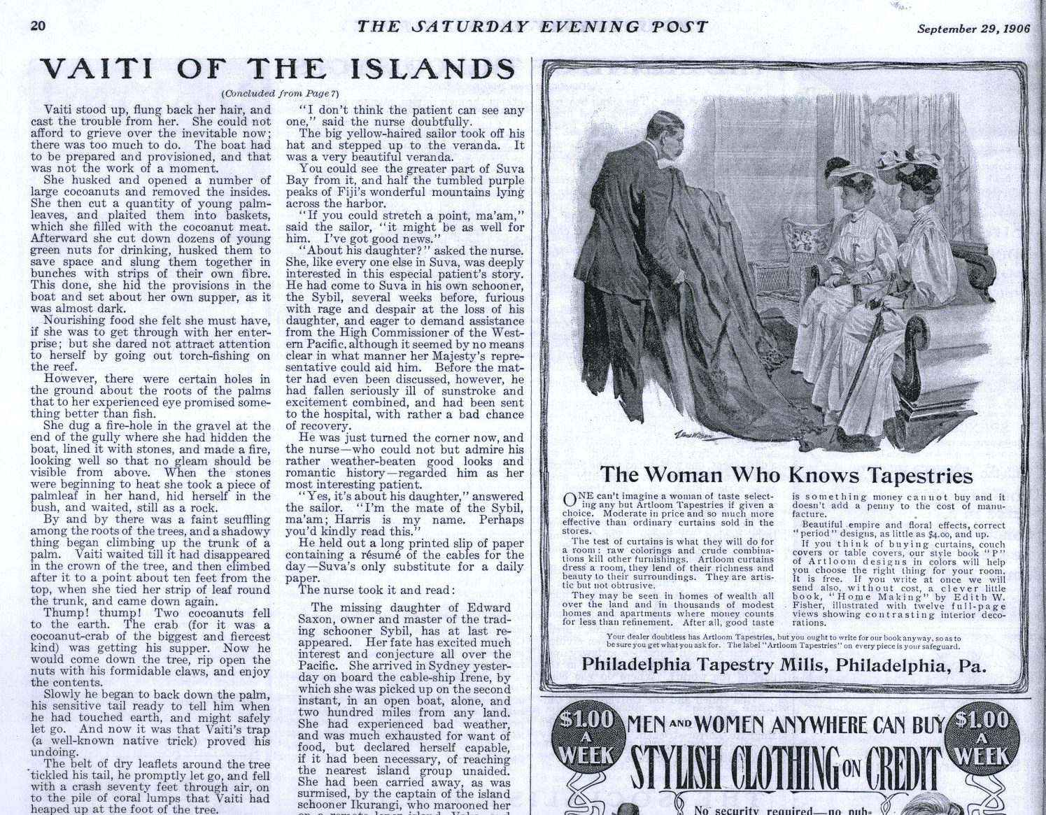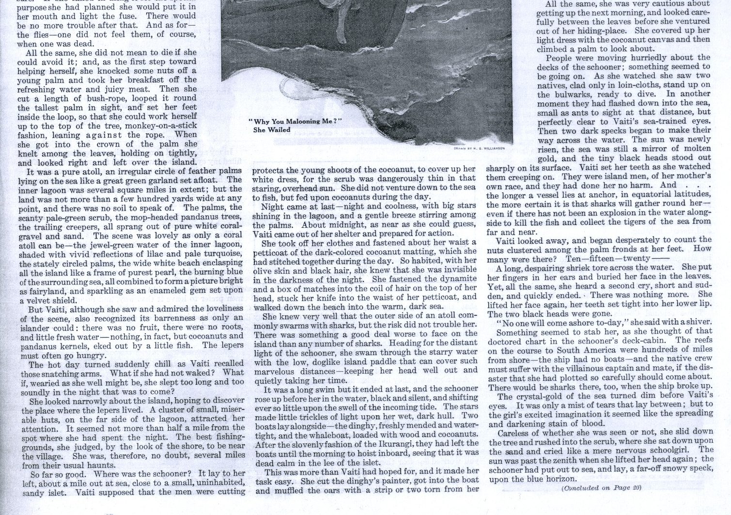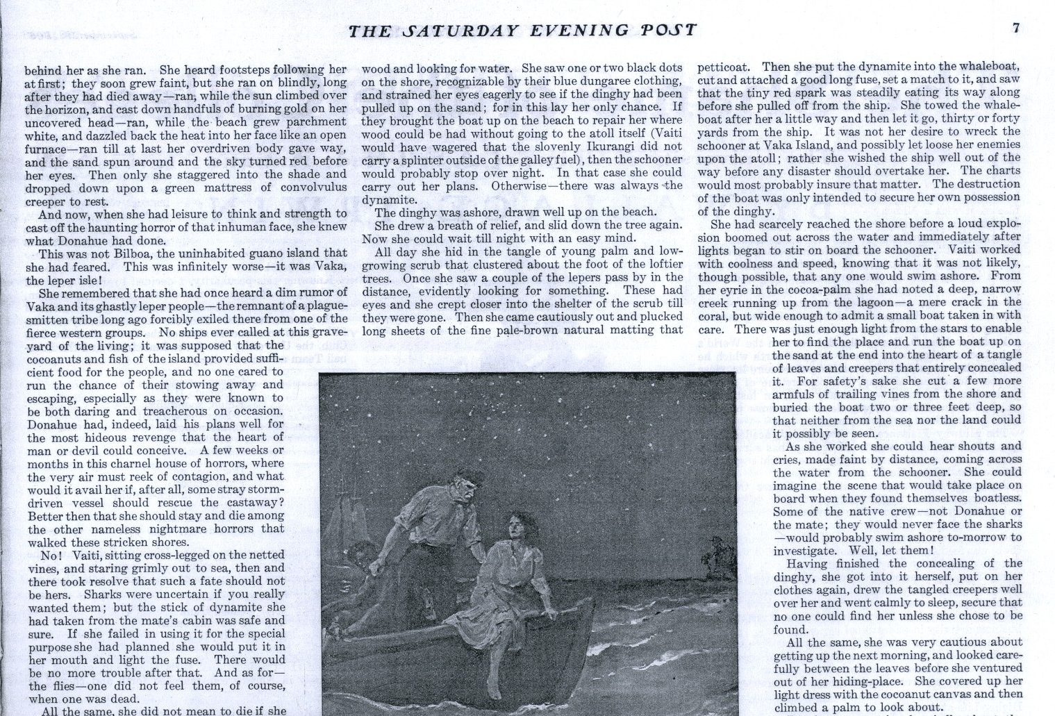were changed from the book to the magazine. An additional 16 images were prepared by Williamson for the articles appearing in 1906. The image of Vaiti on the cover of the book was by another artist apparently with the initials “W.H.”; the artist for the cover of the first The Saturday Evening Post article was T. Rogers.