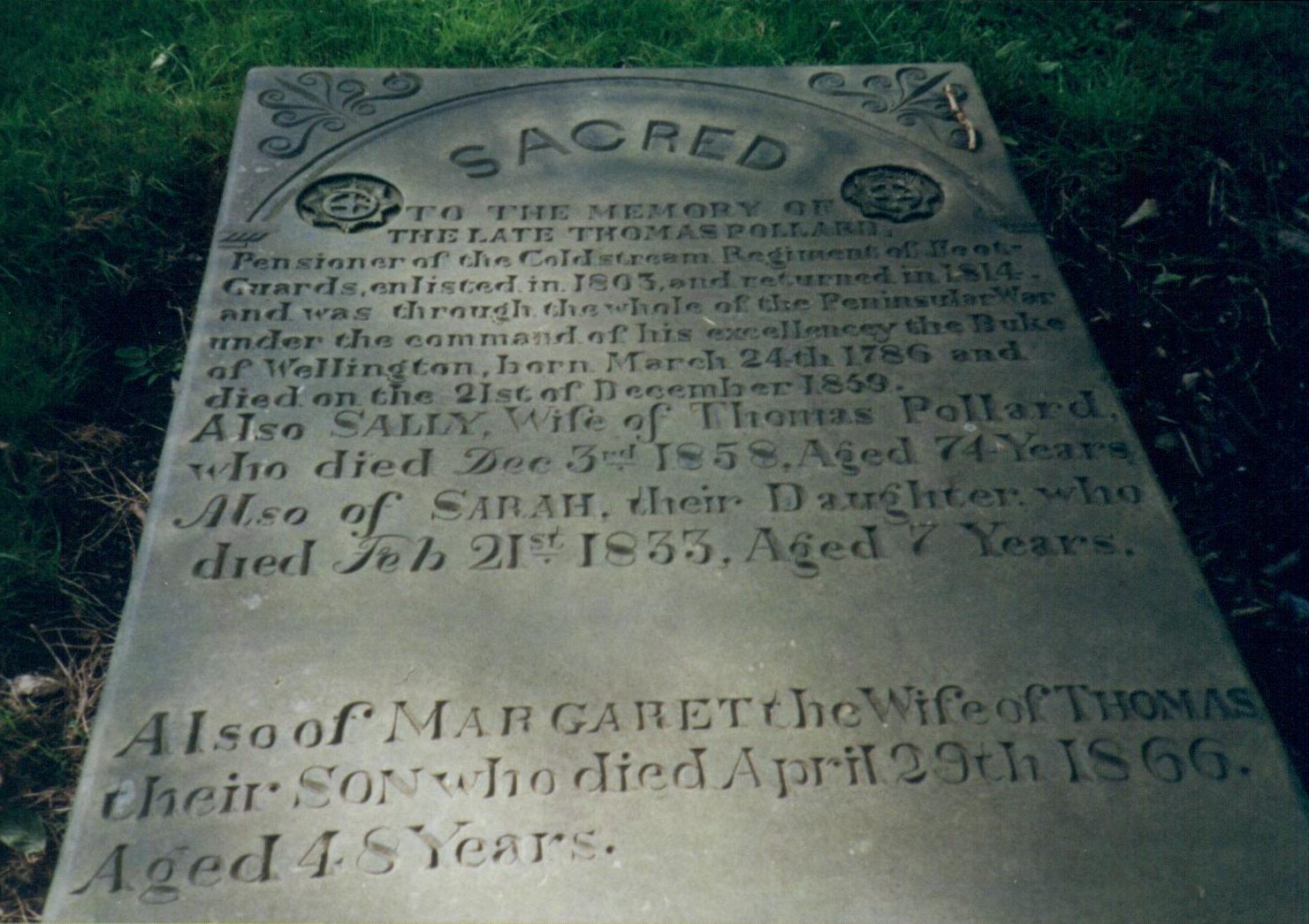 “Sacred to the memory of the late Thomas Pollard, Pensioner of the Coldstream Regiment of Footguards, enlisted in 1803 and returned in 1814 and was through the whole of the Peninsular War under the command of his excellency the Duke of Wellington, born March 24th 1786 and died on the 21st of December 1859.”