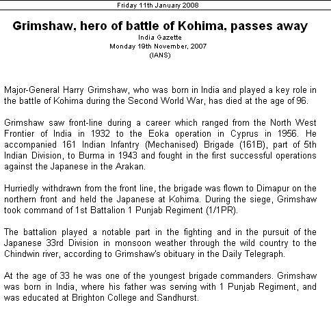 Hurriedly withdrawn from the front line, the brigade was flown to Dimapur on the northern front and held the Japanese at Kohima. During the siege, Grimshaw took command of 1st Battalion 1 Punjab Regiment (1/1PR).