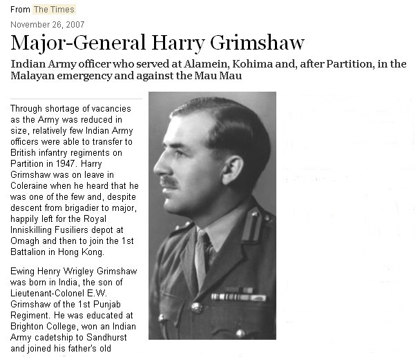 When India gained its independence, Grimshaw transferred to The Royal Inniskilling Fusiliers and went with them to then Malaya.