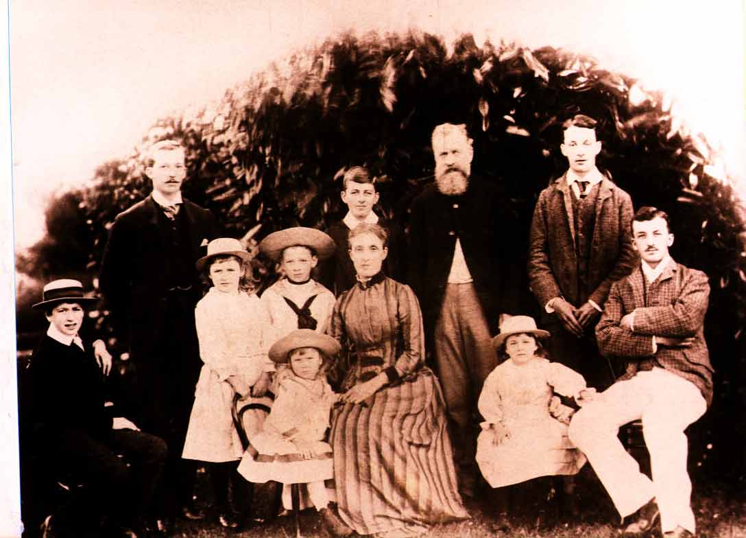 Family photo of Thomas and his family. From left to right, the family members are: Cyril, Ernest, Emma, Roland (above), Clayton (below), Cecil (above), Sarah Elizabeth (Settie), Thomas Wrigley, Gladys, Herbert (Bertie), and Ewing. Judging from the apparent ages of the children, photo taken about 1888. Photo courtesy of Dick Grimshaw.