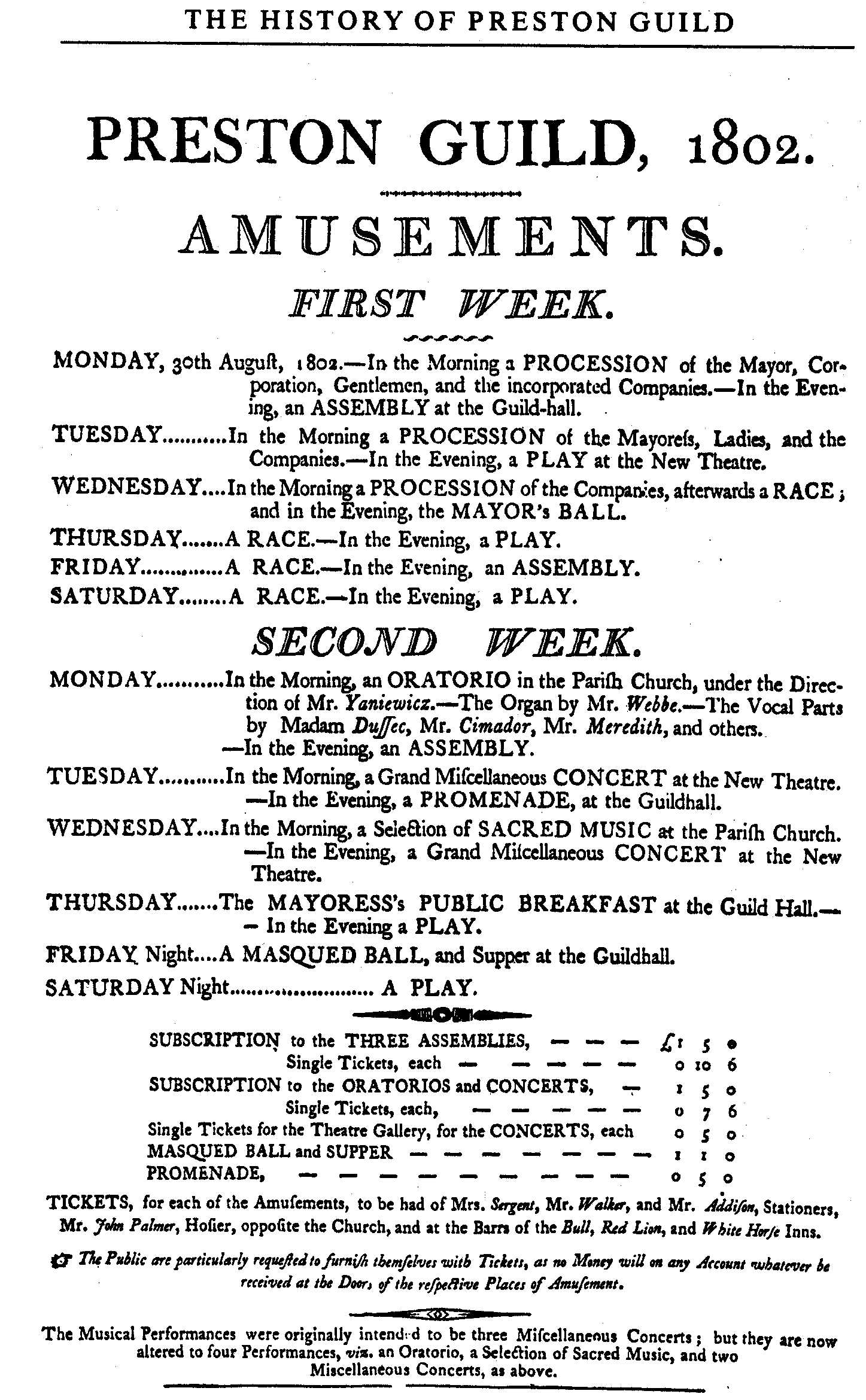 The 1802 Guild was such a large success that Nicholas Grimshaw was asked to be Guild Mayor for a second time (in 1822), an unprecedented honor that not only required manipulation of the normal political rotation of the position of Mayor, but also has not been repeated before or since. A handbill announcing the amusements for the two weeks of the 1802 Guild is shown below.