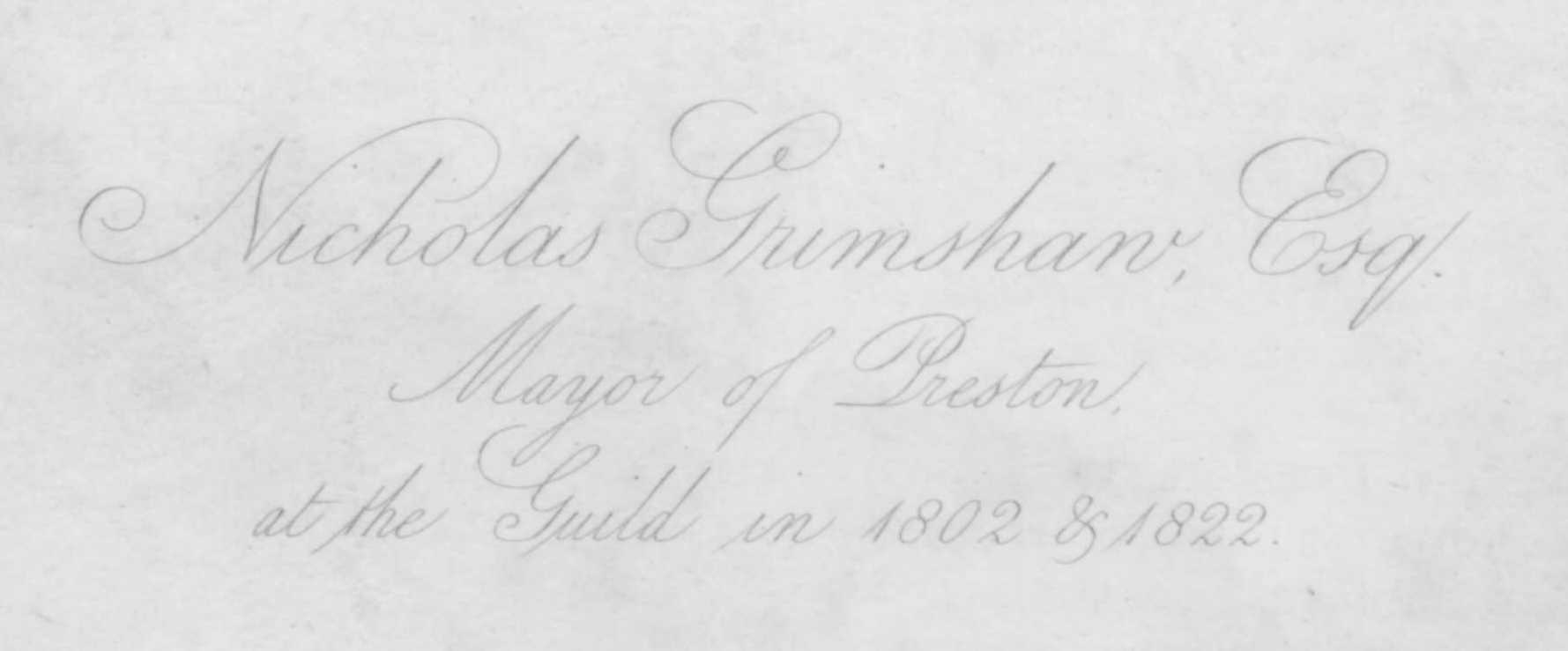 One of the most noted and successful of the Grimshaws in their native Lancashire was Nicholas, a member of the Pendle Forest line who served as mayor of Preston seven times. His noteworthy political career spanned more than 40 years, from 1790 to 1832, and included two Guild mayoralties. An excellent biographical summary for Nicholas was published in the September 22, 1877 edition of The Preston Guardian1 and is used as the basis for most of this webpage.