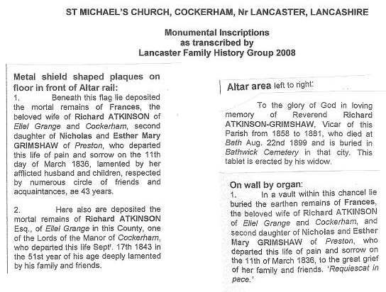Mavis also provided the following monumental inscriptions from St Michaels Church, Cockerham, with entries on Nicholas and Esther Grimshaw.
