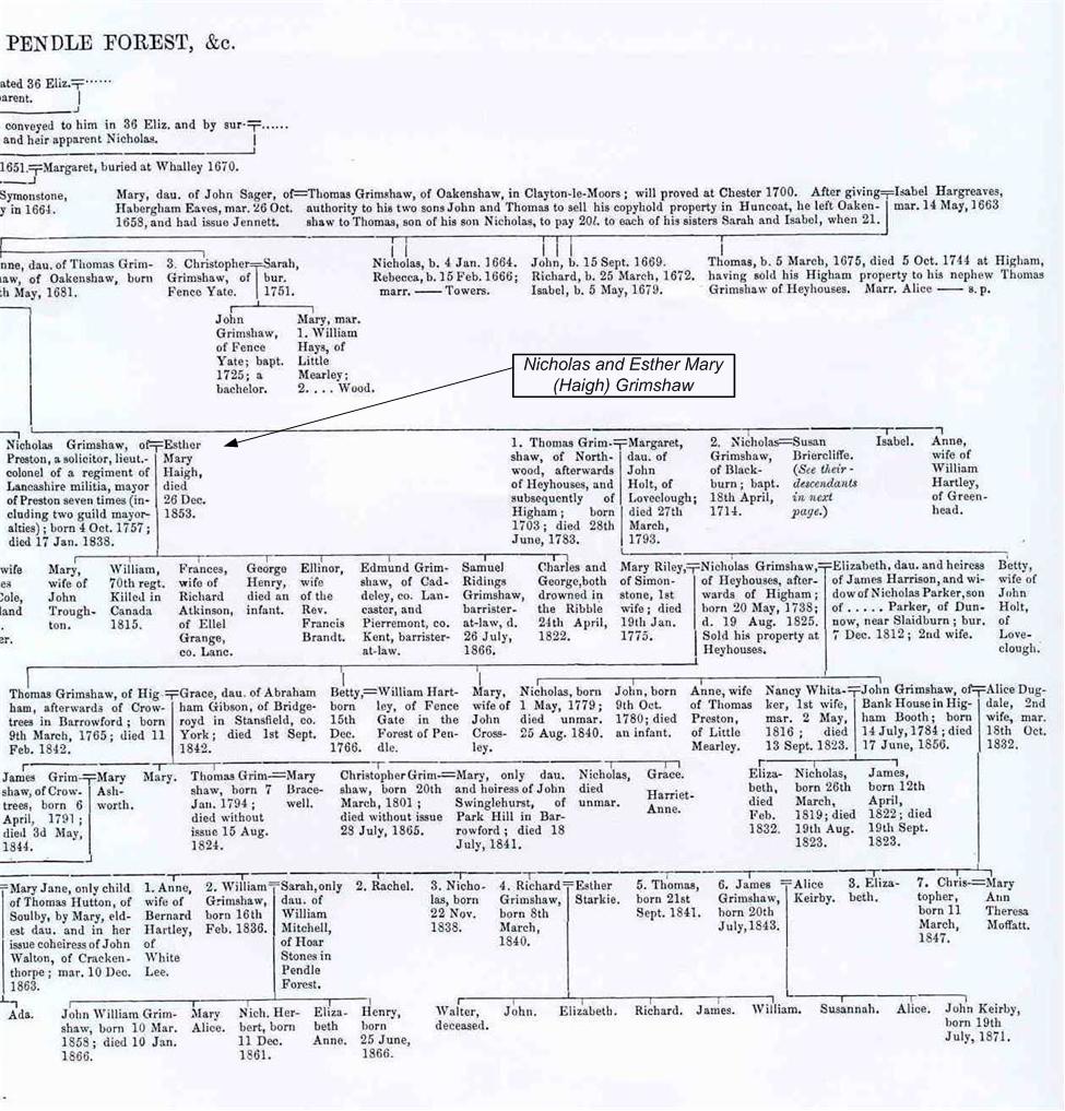 Nicholas’ position in the descendant chart for the Pendle Forest Grimshaws is shown in the companion webpage for the Pendle Forest line. He was the son of Thomas and Mary (Nocks) Grimshaw and the grandson of John and Eleanor (Stephenson) Grimshaw. He was thus a 6th generation descendant of the Nicholas Grimshaw who was the progenitor of the Pendle Forest line. The descendant chart does not include any of Nicholas and Esther Mary (Haigh) Grimshaw’s grandchildren or subsequent descendants.