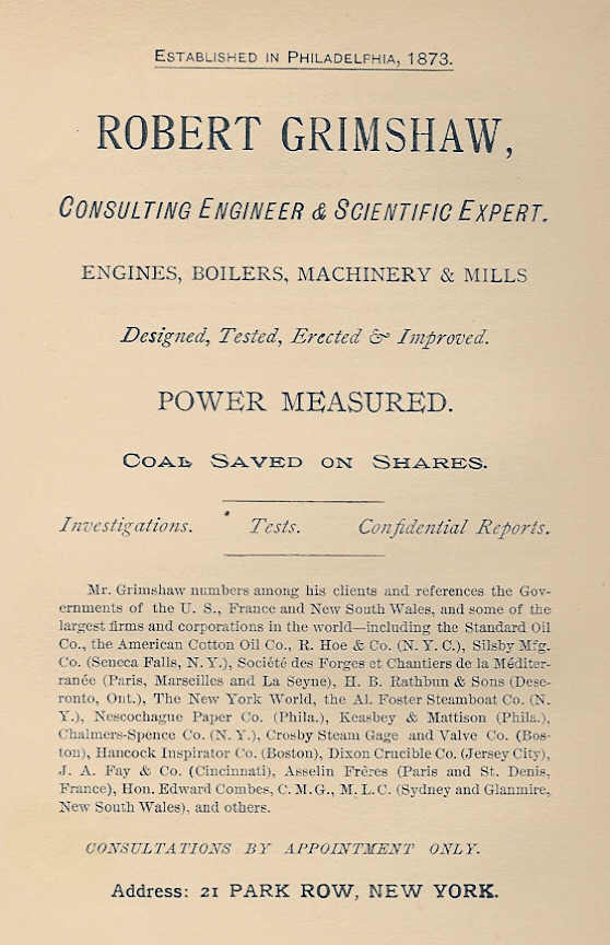 Figure 2. Robert Grimshaws advertisement for consulting services. This example appeared in his book, “Fifty Years Hence” (described further down on this webpage,) which was published in 1892, after Robert had been in practice for nearly 20 years.