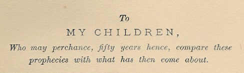 As a side note, Robert dedicated the book to his children, “Who may perchance, fifty years hence, compare these prophecies with what has then come about.” Robert apparently lived long enough (to at least 1940) to make the comparison for himself!