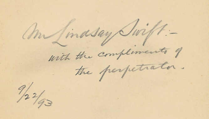Figure 5 below includes images from a copy of “Fifty Years Hence,” including the cover, title page, and dedication (to Robert’s children.) This copy of the book also has an penciled inscription, apparently made by Robert — “To Mr. Lindsay Swift:- with the compliments of the perpetrator. 9/22/93.”