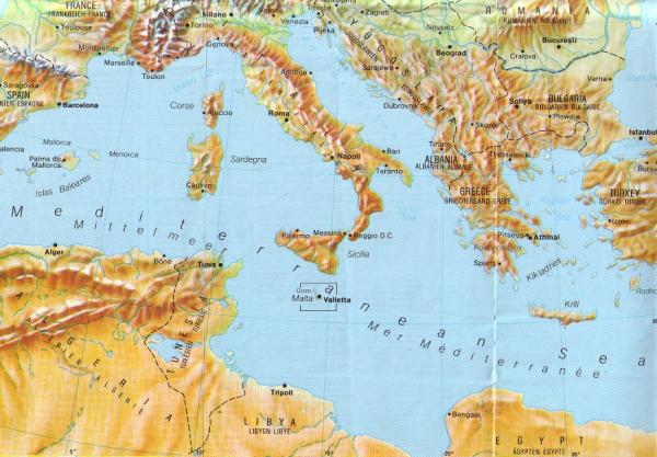 Where is Malta located? Just south of Sicily in the middle of the Mediterranean (see rectangle in map below).