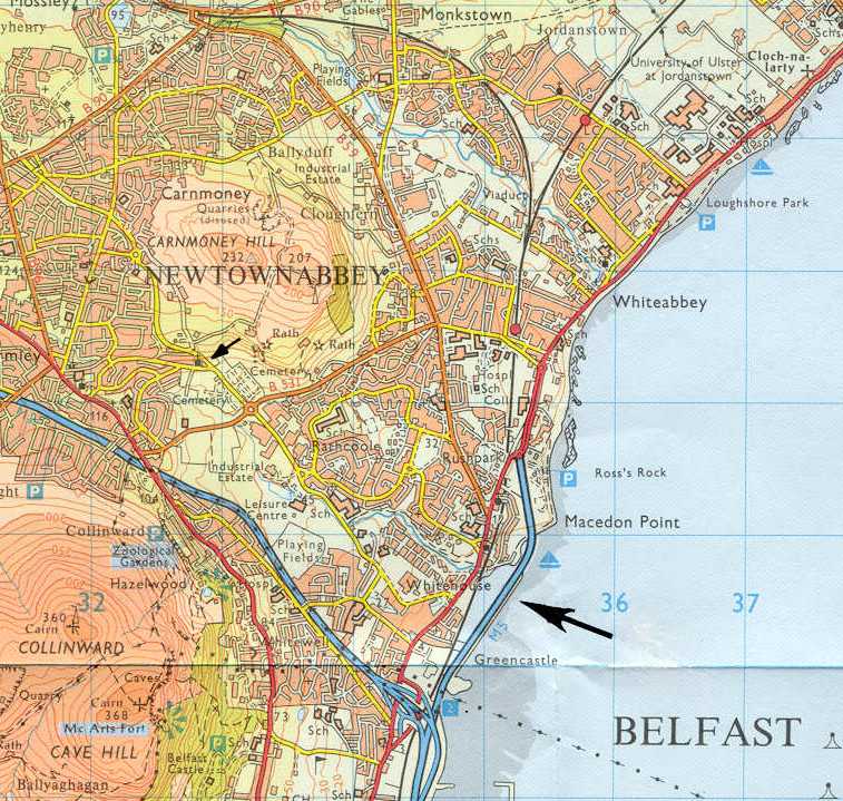 Figure 3. Recent map2 showing location of Church of Holy Evangelists in Carnmoney (small arrow). The large arrow shows the location of Whitehouse, which is described on a companion webpage.